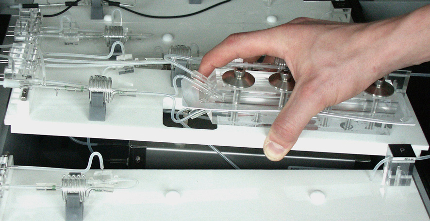 ケミストリーモジュールは各種アプリケーションの分析フローダイアグラムによって異なります。UV分解や加熱リアクターを必要とするモジュールでは、モジュールが固定されたボード下部に各種リアクターが固定されてコンパクトな構成になっています。SA3000では最大3項目、SA5000では最大5項目のケミストリーモジュールを組み合わせてユニットを構成します。